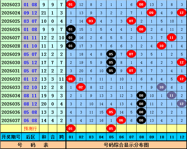 后区上期开出奖号06和08,该组合历史上出现了43次,其下期奖号频次分别为:号码08出现11次,09出现10次,06出现9次,07出现8次,04、10出现7次,01、03、11、12出现6次,02、05出现4次,本期后区参考号码01、04、05、11,精选两码01和05。